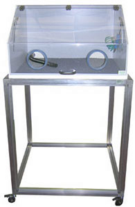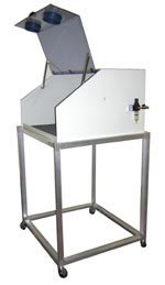 White PVC box with transparent cover fitted with holes half sleeves tyvek, for the handling of books or documents to dust. The bottom of the box is covered with carpet, synthetic rubber and soft filter. On the right side is mounted inside a compressed-air blower (compressor silent housed under the structure) with a pressure regulator outside.