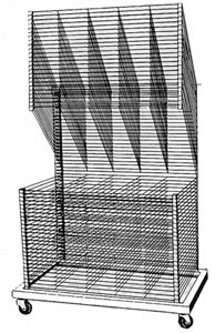 FLOOR DRIER 50 MOBILE SHELF 100X140 cm. Mobile support frame made from steel, oven painted with epoxy powedrs. Every shelf is equipped with strong polished spring. Working space between frames 20 mm. DIMENSIONS 1100 x 1500 x 1800 m